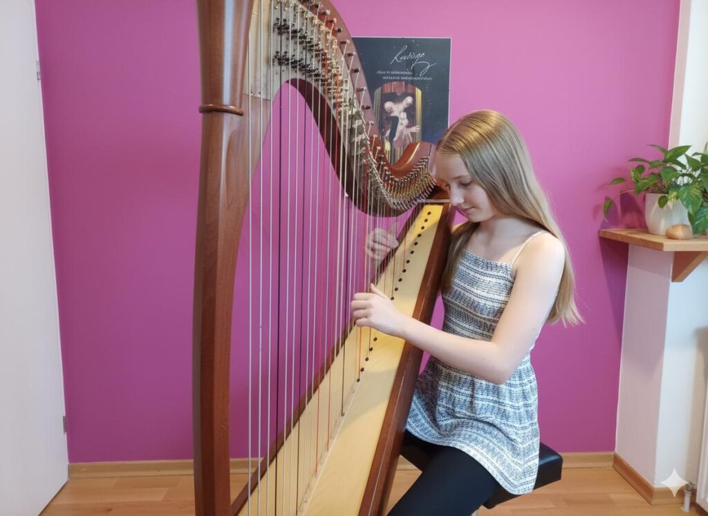 Mir macht Harfe spielen bei Frau Kühne viel Spaß! Ich lerne jede Woche etwas Neues. Die Harfe klingt sehr schön und ich freue mich immer auf die Stunde.